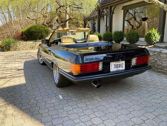 This 1982 500 SL AMG 5.0 is one of a limited number of ordered by Richard Buxbaum’s for Classic Motors, in Westmont, Ill. and is powered by an AMG tuned 5.0 liter (M117) -engine paired to a 5-speed manual transmission. Specified with Mercedes-Benz factory "performance first" options, namely the 5-speed Getrag manual transmission, a limited slip differential (258) and ABS braking system (470). From the M.B. factory the black 500SL was sent to AMG in Affalterbach for additional performance and styling upgrades. The AMG installed upgrades include Power Increase (CM12) which includes ported and polished cylinder heads, AMG performance camshafts and exhaust system. AMG styling upgrades include Front Spoiler, Lower Body, Blacked-out Chrome and black BBS aluminum wheels. First sold by Classic Motors in1982 this 500SL AMG 5.0 remained with the first owner until 2007 when it was acquired by current owner. During ownership, the original Orthopedic front seats were replaced by Recaro seats along with new sun visors (see receipt). The exhaust has been replaced to a single pipe from mid car to back, and the original steering wheel has been changed to a smaller AMG unit. Wheels are AMG Penta models (16 x 8) with Toyo Proxes. The hard top and the original black BBS basketweave wheels are included with the car.